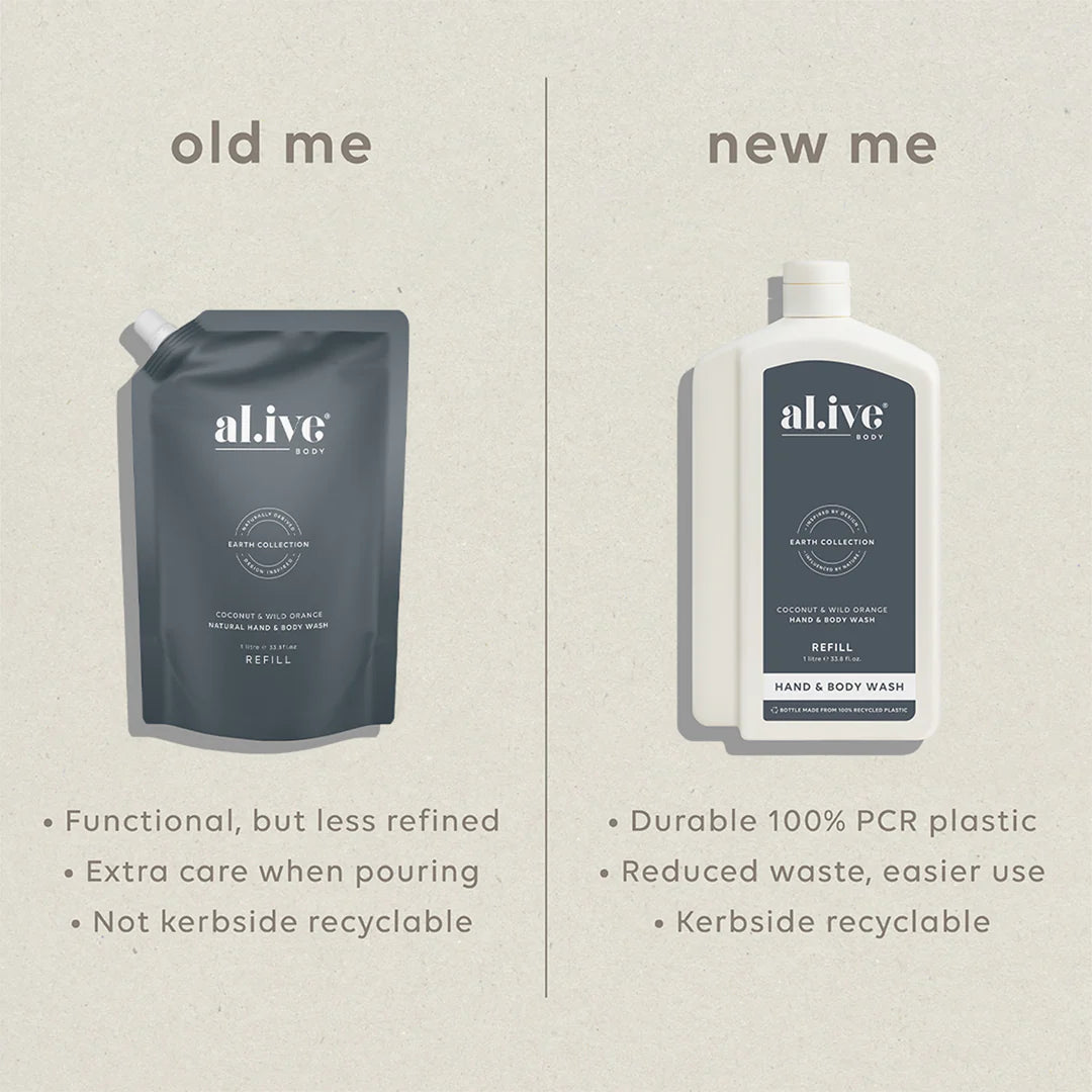 Each refill is designed to refill the 500ml al.ive body Hand & Body Wash bottle twice. With a controlled-flow spout for mess-free pouring, compact shape for easy storage, and full kerbside recyclability, it offers a practical, premium solution while extending the life of the product you already love.