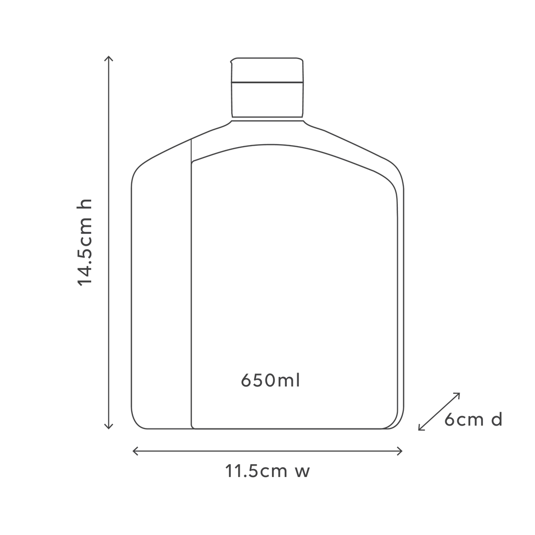 Our 650 ml bottles are made from 100% Post-Consumer Recycled (PCR) HDPE plastic and are fully kerbside recyclable. The bottle label is made from PP with 30% post-industrial waste and can be left on during recycling. The cap is made from PP with a PE liner and is also recyclable when left attached.
